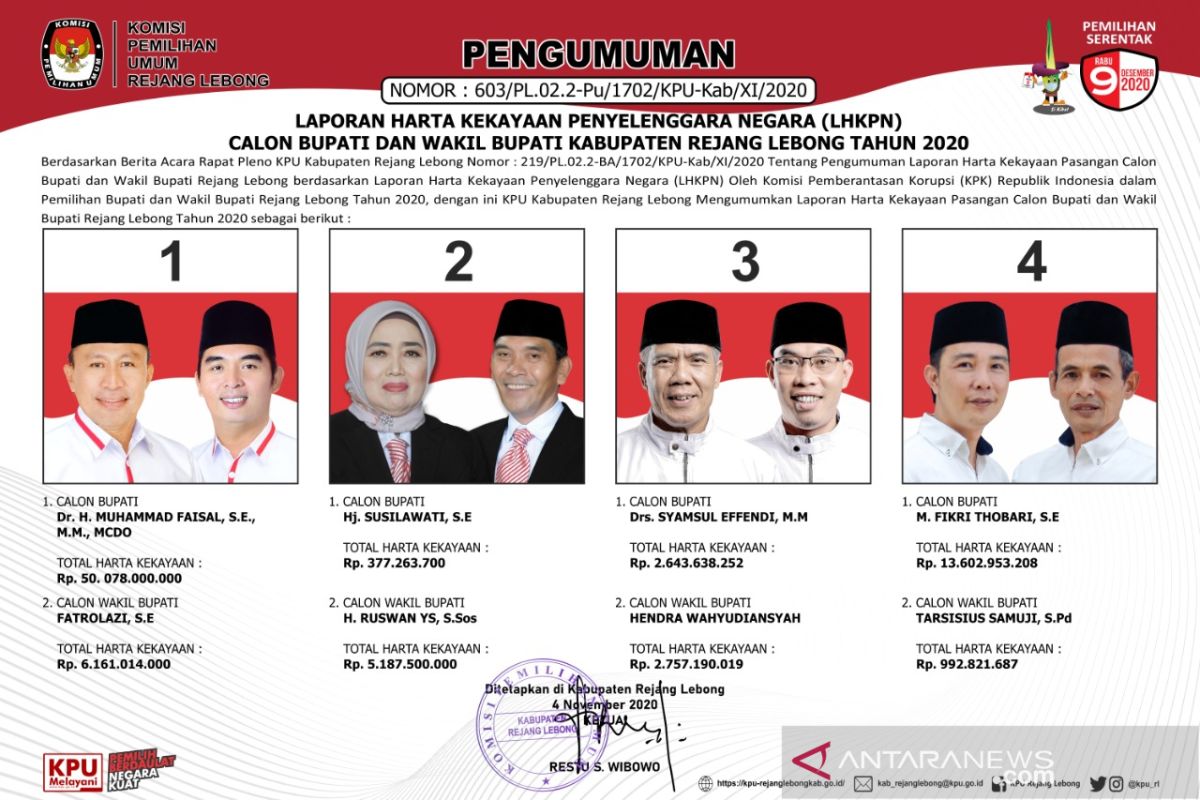 Rejang Lebong (ANTARA) - Komisi Pemilihan Umum (KPU) Kabupaten Rejang Lebong, Provinsi Bengkulu, mengumumkan Laporan Hasil Kekayaan Penyelenggara Negara (LHKPN) milik empat pasangan calon peserta Pilkada Serentak 2020 di wilayah itu.