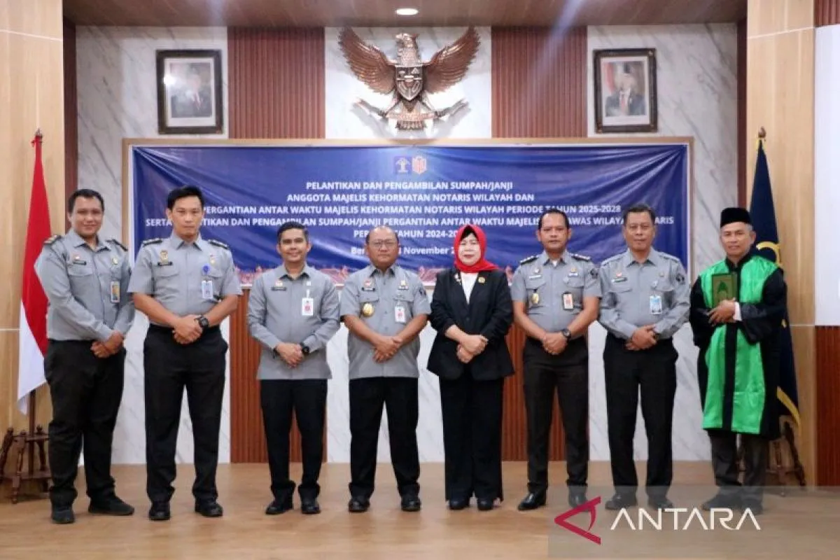 Bengkulu (ANTARA) - Kepala Kantor Wilayah Kementerian Hukum Bengkulu Zulhairi didampingi Kadiv Pelayanan Hukum Machyudhie mengikuti pelaksanaan Pelantikan dan Pengambilan Sumpah/Janji Anggota Majelis Kehormatan Notaris Wilayah (MKNW) Periode 2025–2028 secara virtual di Aula Soekarno. Pelantikan yang dipimpin oleh Direktur Jenderal Administrasi Hukum Umum Widodo ini dilaksanakan terpusat dari Kanwil Kemenkum Jawa Barat, Senin (8/12/2025). Adapun anggota MKNW Provinsi Bengkulu yang dilantik yakni Idayanti Said. Pelantikan MKNW hari ini merupakan susulan kegiatan tanggal 30 Oktober 2025 lalu, sehingga melengkapi keanggotaan MKNW dan menjadi agenda strategis dalam memperkuat pengawasan serta menjaga marwah profesi notaris sebagai pejabat umum yang memiliki peran sentral dalam penyelenggaraan pelayanan hukum bagi masyarakat.