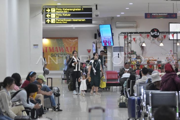 Calon penumpang pesawat menunggu keberangkatan di ruang tunggu Bandar Udara Fatmawati-Soekarno, Kota Bengkulu, Bengkulu, Rabu (26/3/2024). Memasuki H-5 Lebaran PT Angkasa Pura II Cabang Bandara Fatmawati-Soekarno mencatat 2.520 pergerakan pemudik dari 26 penerbangan yang masing-masingn di terminal kedatangan sebanyak 1.567 penumpang dan di terminal keberangkatan berjumlah 953 penumpang serta diperkirakan masih akan terus melonjak pada 27-29 Maret 2025. ANTARA FOTO/Muhammad Izfaldi/tom.