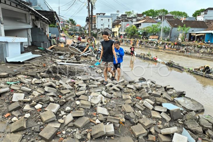 Warga berjalan di jalanan yang rusak akibat diterjang banjir di kawasan Jalan Bukit Barisan, Denpasar, Bali, Rabu (10/9/2025). Sejumlah bangunan seperti ruko, toko dan rumah warga di wilayah Denpasar mengalami kerusakan akibat banjir yang terjadi di sejumlah titik sejak Rabu pagi. ANTARA FOTO/Fikri Yusuf/nz