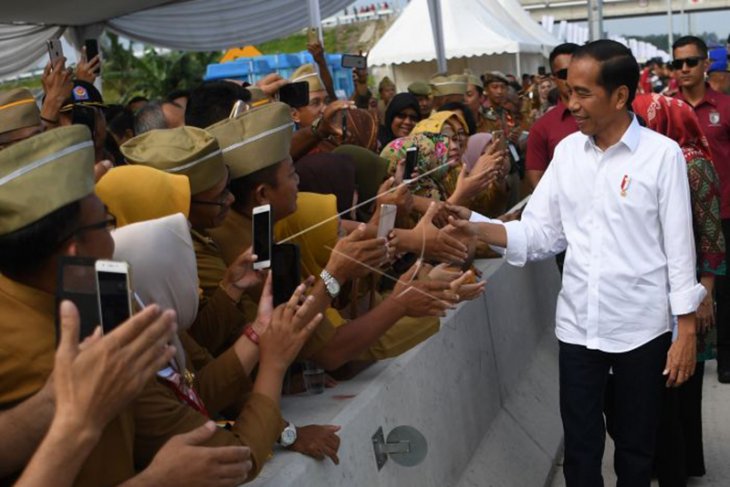 Presiden Joko Widodo menyalami aparatur sipil negara (ASN) sebelum meresmikan tol Trans Sumatera ruas Bakauheni-Terbanggi Besar di Gerbang Tol Natar, Lampung Selatan, Lampung, Jumat (8/3/2019). Presiden meresmikan Jalan Tol Trans Sumatera ruas Bakauheni - Terbanggi Tinggi Besar sepanjang 140,9 kilometer dalam rangka konektivitas dan percepatan jalur distribusi dari Pulau Jawa ke Sumatera atau sebaliknya. (ANTARA FOTO)