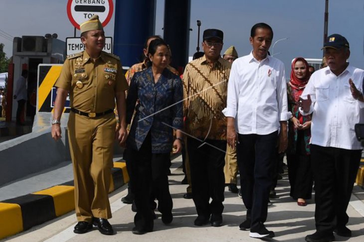 Presiden Joko Widodo (kedua kanan) berbincang dengan Menteri PUPR Basuki Hadimuljono (kanan), Menteri Perhubungan Budi Karya Sumadi (tengah), Menteri BUMN Rini Soemarno (kedua kiri) dan Gubernur Lampung Muhammad Ridho Ficardo seusai meresmikan tol Trans Sumatera ruas Bakauheni-Terbanggi Besar di Gerbang Tol Natar, Lampung Selatan, Lampung, Jumat (8/3/2019). Presiden meresmikan Jalan Tol Trans Sumatera ruas Bakauheni - Terbanggi Tinggi Besar sepanjang 140,9 km dalam rangka konektivitas dan percepatan jalur distribusi dari Pulau Jawa ke Sumatera atau sebaliknya. (ANTARA FOTO)